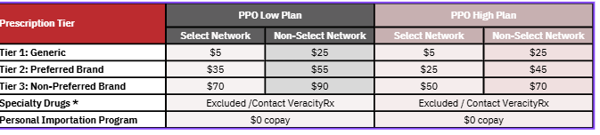 Although specialty drugs continue to be excluded on your health plan, VeracityRx may be able to help you find the best price for your specialty medications. Contact VeracityRx Pharmacy Services at www.veracity-rx.com for more information.
