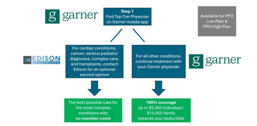 Garner Health is your first stop to find high-quality providers. The Edison Centers of Excellence program is a voluntary, second-opinion, high-quality resource for specific diagnoses. The Edison Smart Care Centers are available with no member cost for these conditions.