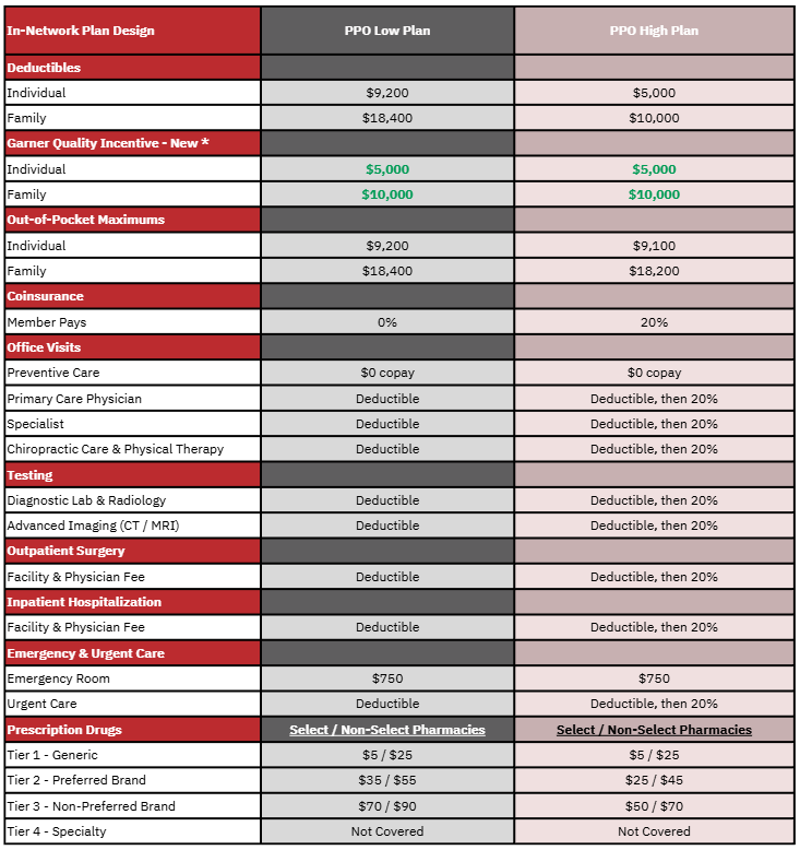 *Emergency room and prescription drug benefits are not eligible for the Garner high-quality incentive.