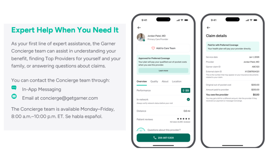 Garner Health is a new free benefit that helps you find the highest quality doctors while saving you money. For both plan options, when you use the Garner app, find a recommended doctor, and visit that doctor, you will receive 100% coverage! Emergency room visits and prescription drugs are not eligible for the Garner incentive benefit.